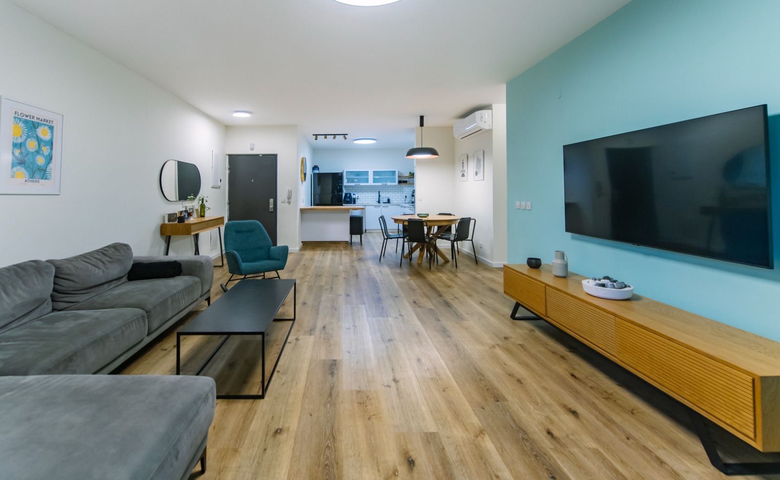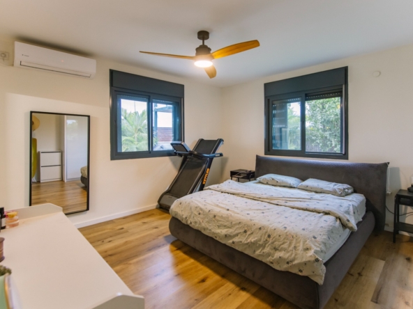 פנים הדירה משתרע על פני כ 112 מ”ר בנוי בקומה אחת, עם חלל אירוח מרווח וסוויטת הורים גדולה במיוחד, המעניקה פרטיות ונוחות ברמה גבוהה. התכנון הפנימי מאפשר זרימה טבעית בין אזורי המגורים והאירוח ומדגיש את תחושת המרחב.