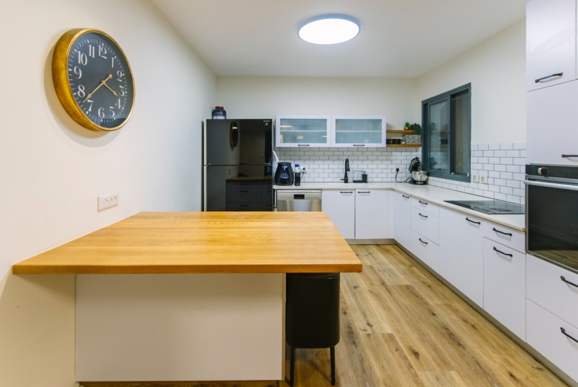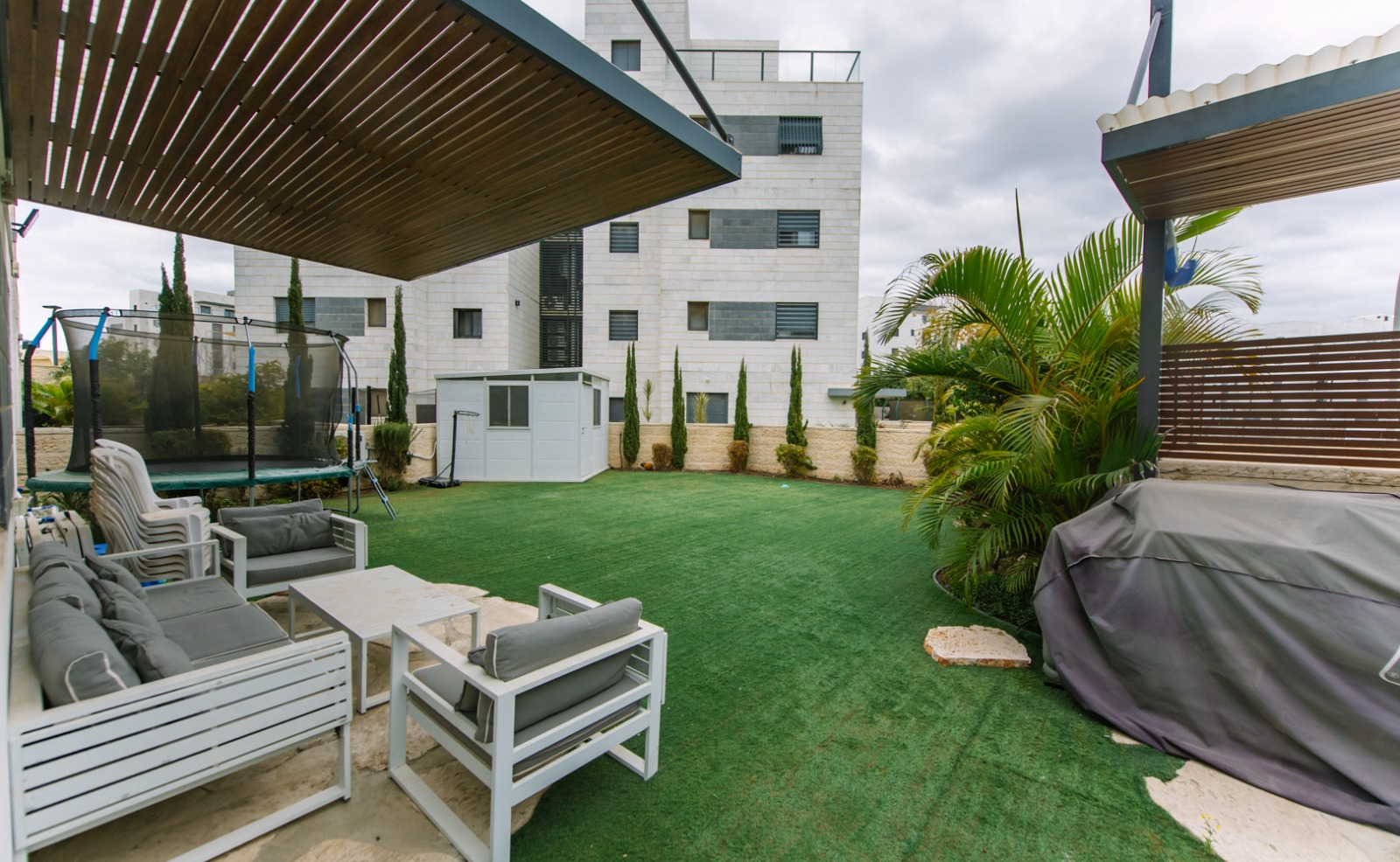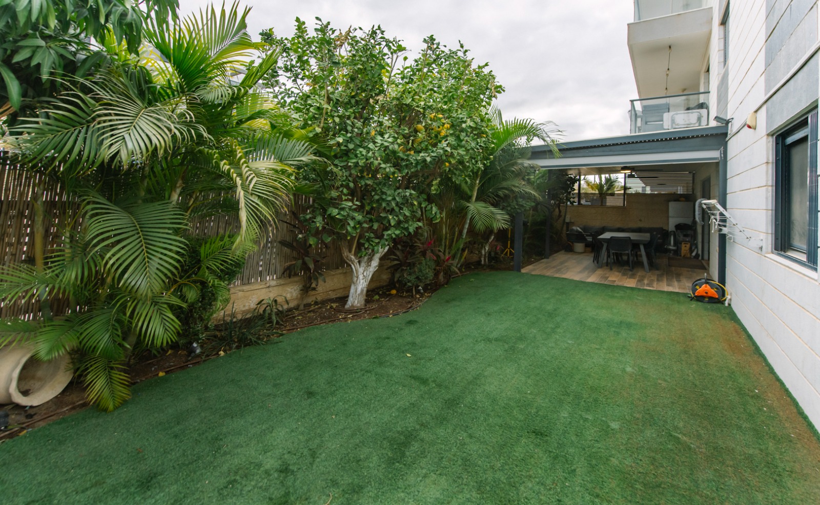 גולת הכותרת היא הגינה. כ 230 מ”ר של חוץ מטופח ושקט, הכולל פינות ישיבה מוצלות בפרגולות אלומיניום איכותיות, דשא סינטטי לתחזוקה קלה ומערכת השקיה אוטומטית. עצי פרי בוגרים ומניבים משלימים תחושת טבע אמיתית ומעניקים אווירה של בית.